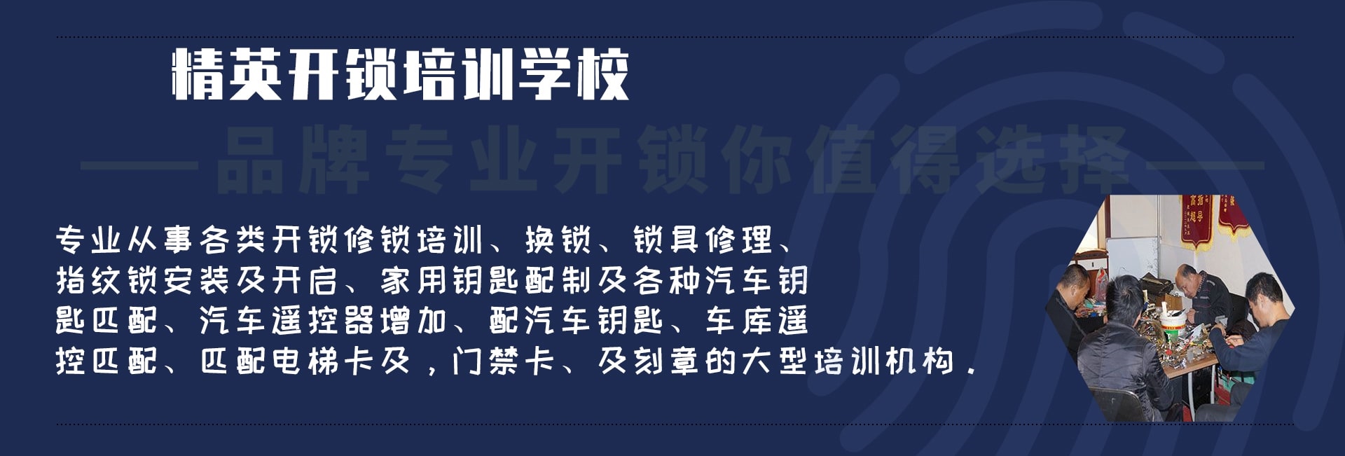 S精英開鎖培訓學校 歡迎參觀薊縣開鎖培訓學校網站!我們是正規開鎖培訓學校,是經工商注冊備案. 經勞動部門批準面向全國招生,提供開鎖技術培訓,本技校成立以來,本著“誠信,良心,用心”的原則方針。先后培育了全國各地有突出貢獻的優秀鎖匠,培育優秀道德鎖匠。本校主要從事開鎖學校培訓、開鎖技術培訓、薊州開鎖培訓班、汽車開鎖學校等培訓,本校才用1對1教學,奉客戶為上帝的原則去教學,精英開鎖技術學校設有專業的教室,完善的設備,本技校有技術老師8名,設有直營店面3家,學員畢業經技術堅定部門合格,發職業資格證書(鎖具修理工)全國通用。